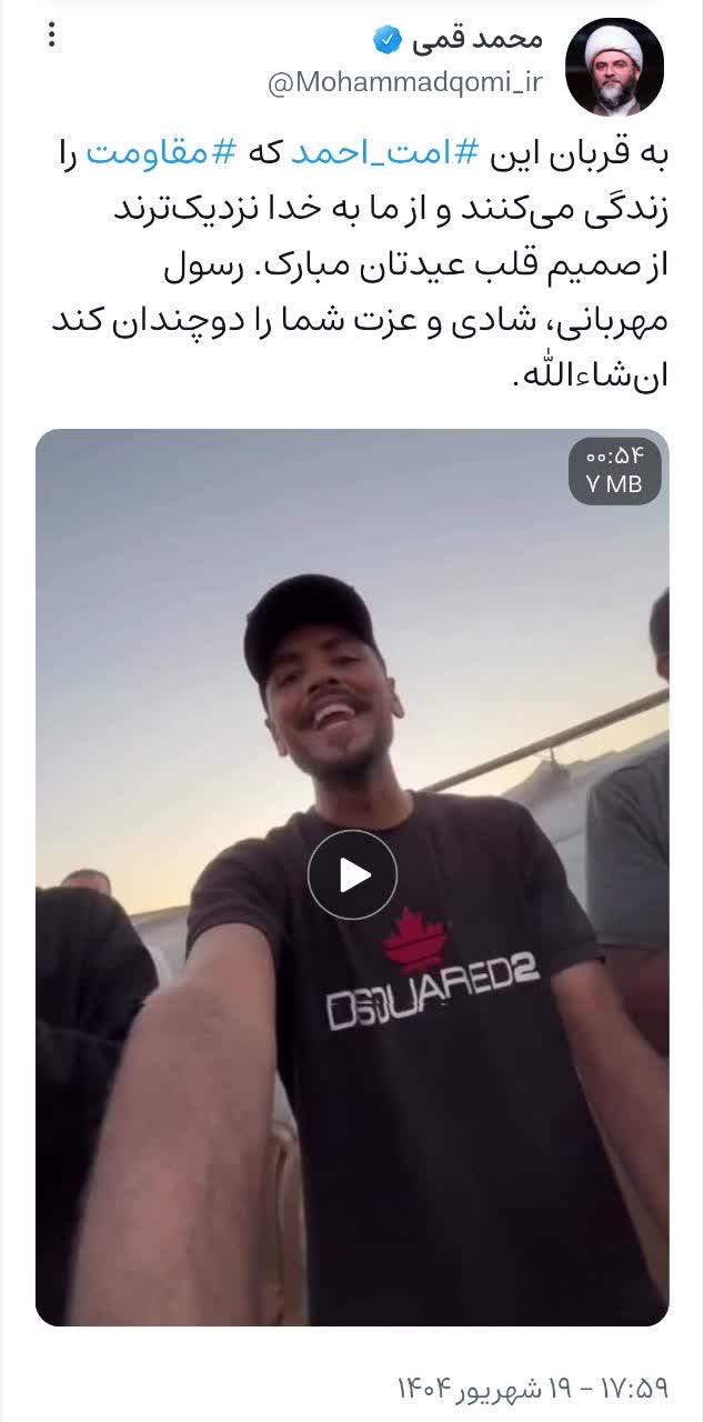به گزارش روابط عمومی سازمان تبلیغات اسلامی، حجتالاسلام محمد قمی، رئیس سازمان تبلیغات اسلامی با انتشار کلیپی از رقص و شادی مردم غزه در سالروز تولد حضرت محمد (ص) در صفحه شخصی خود در شبکه اجتماعی ویراستی نوشت؛