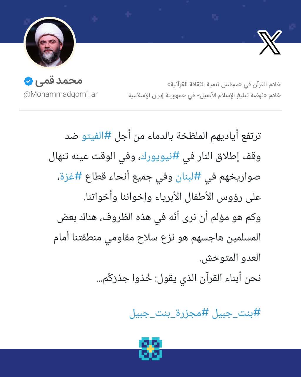 به گزارش روابط عمومی سازمان تبلیغات اسلامی، حجت‌الاسلام محمد قمی، رئیس سازمان تبلیغات اسلامی، در صفحه شخصی خود در شبکه اجتماعی ایکس پس از حمله‌ی تروریستی به خودرو یک خانواده شش نفره در جنوب لبنان که موجب به شهادت رسیدن تمامی اعضای این خانواده شد به زبان عربی نوشت؛