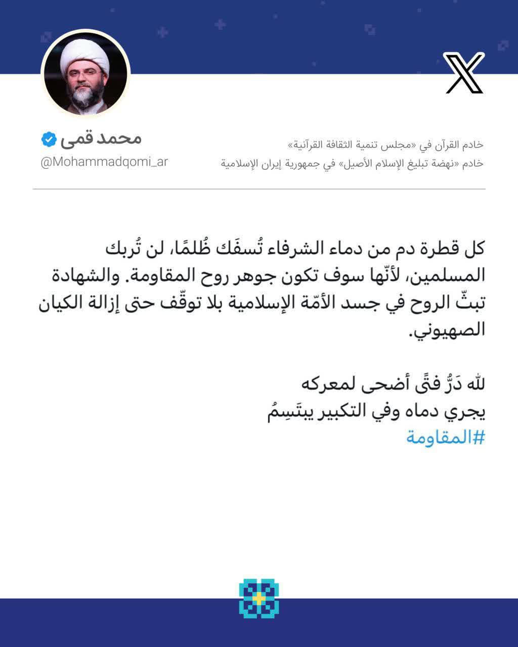 به گزارش روابط عمومی سازمان تبلیغات اسلامی، حجت‌الاسلام محمد قمی، رئیس سازمان تبلیغات اسلامی در صفحه شخصی خود در شبکه اجتماعی ایکس ویژه مخاطبان عرب زبان به مناسبت شهادت شهدای اخیر لبنان و مقاومت نوشت؛
